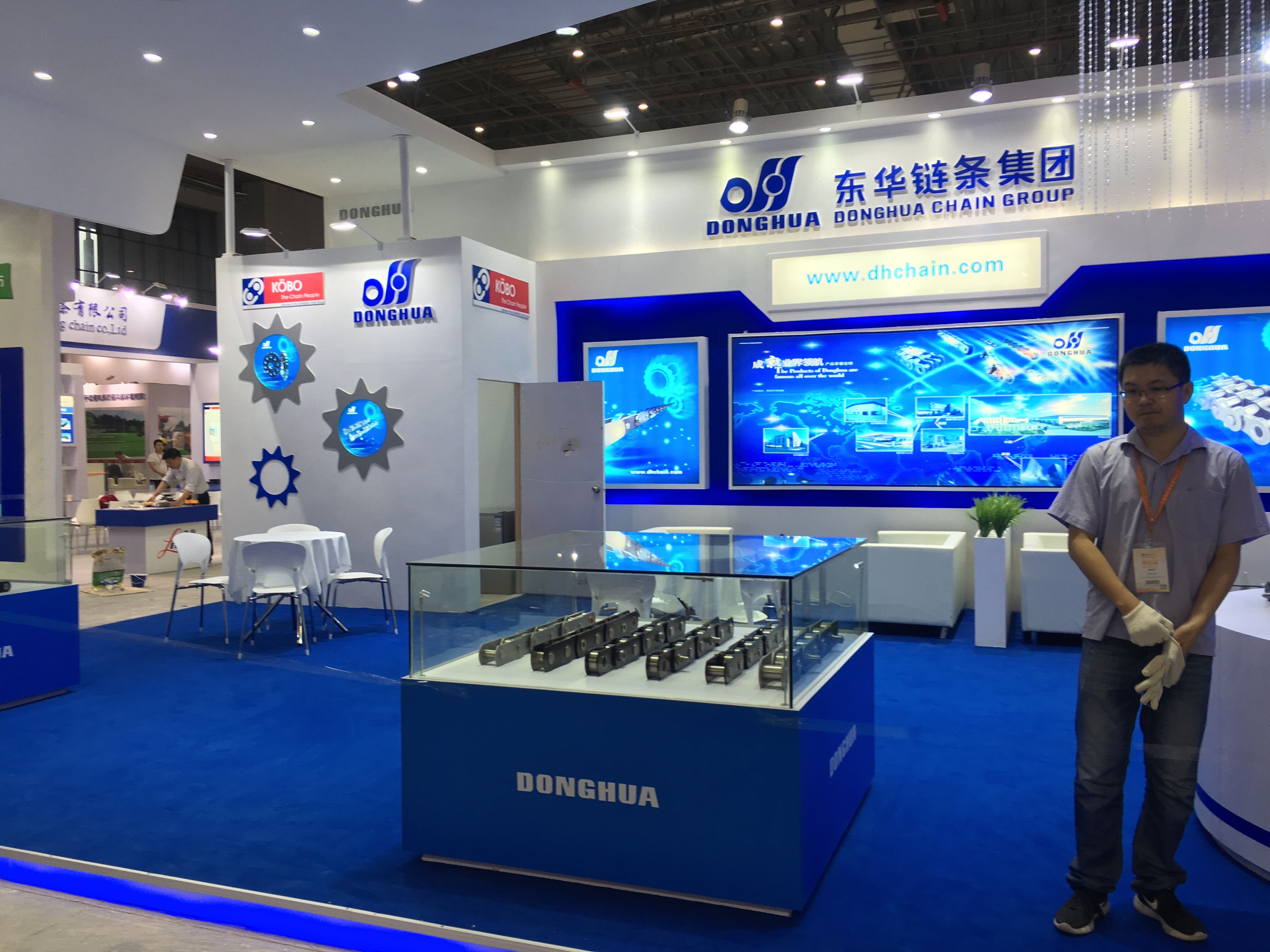 契合東華鏈條的品牌形象和產品特性,采用開放式式的造型,再搭配燈具燈光的效果,襯托出展位現代、清新氛圍,突出一種現代、高端的時尚品味。